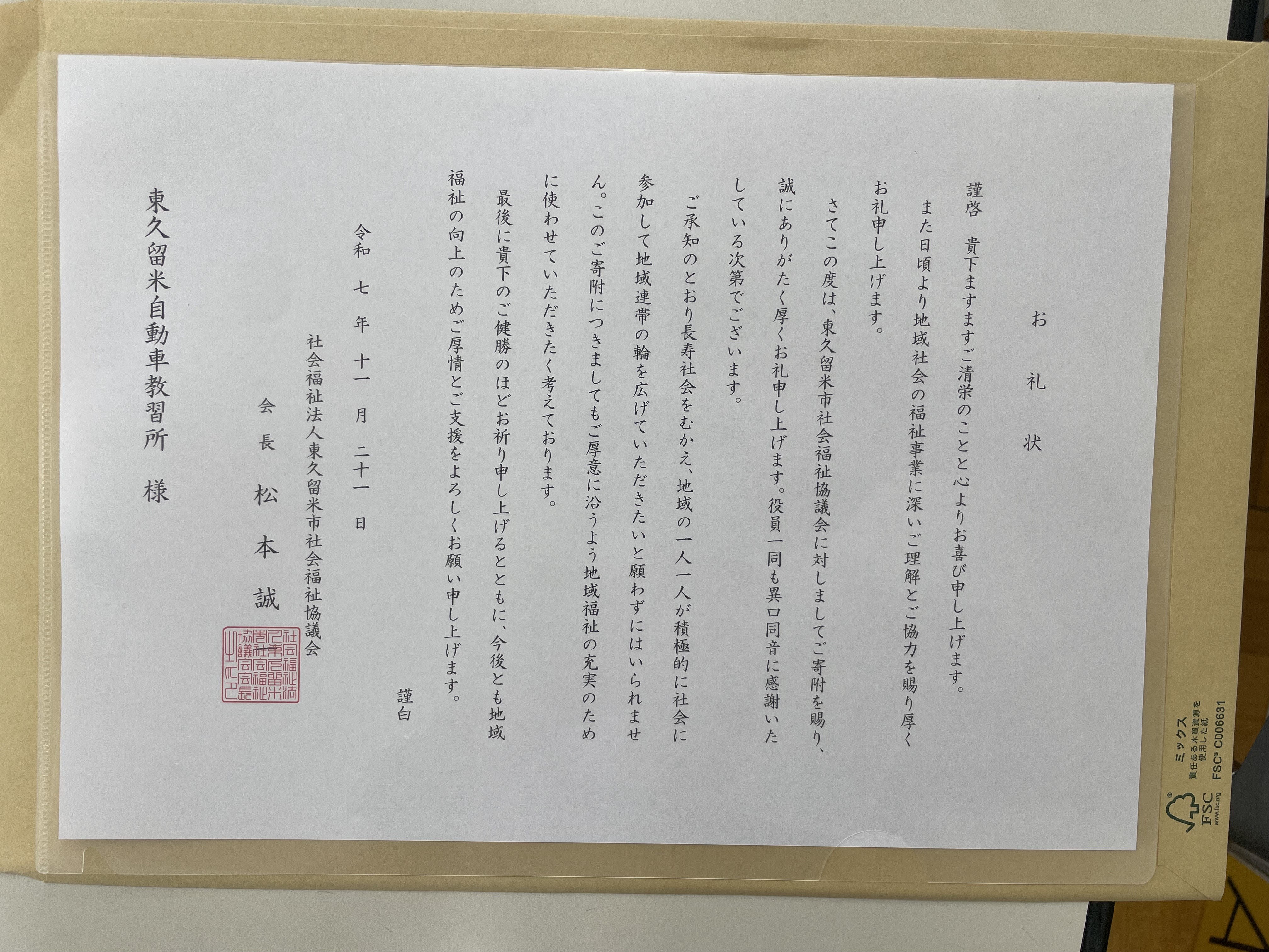 ***************11/16(日)当教習所で開催したフリーマーケットの出店手数料他全ての収益を社会福祉法人 東久留米市社会福祉協議会に寄付させて頂きました!これからも地域の皆様と共に東久留米を盛り上げるべく、くるドラなりの貢献を沢山考えていきたいと思います!